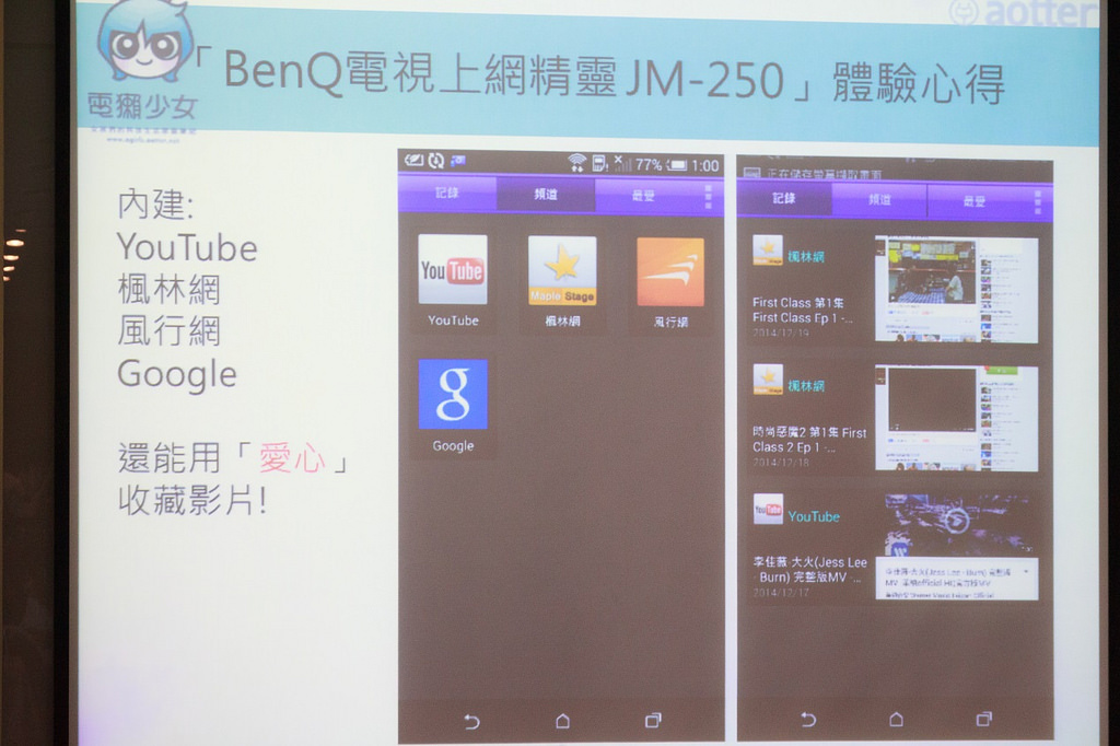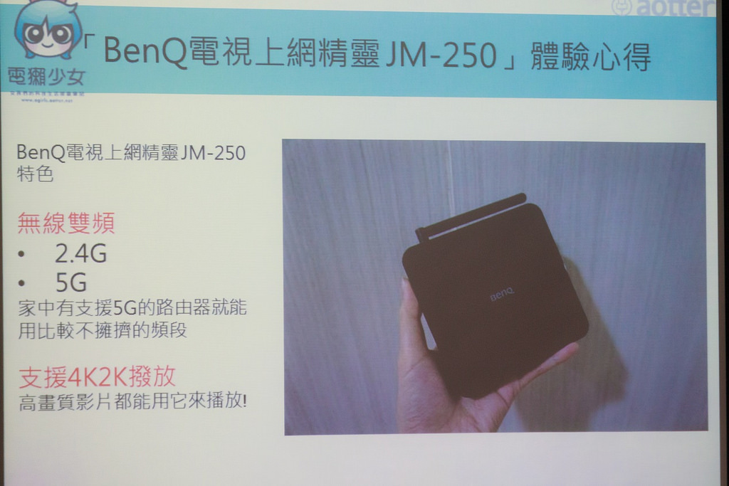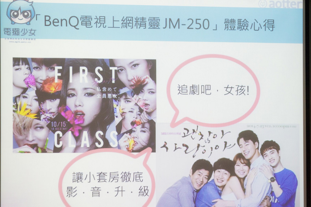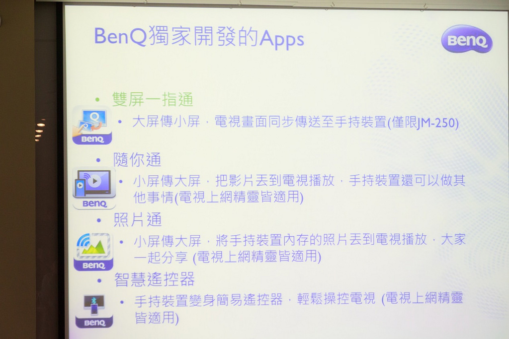 這次的JM-250的成熟度相當的高,軟、硬體的規格也都很好,不論軟、硬體上都可以看出BenQ的用心,可使用者的需求考慮進去,像是遙控鼠的設計、app方面的設計。