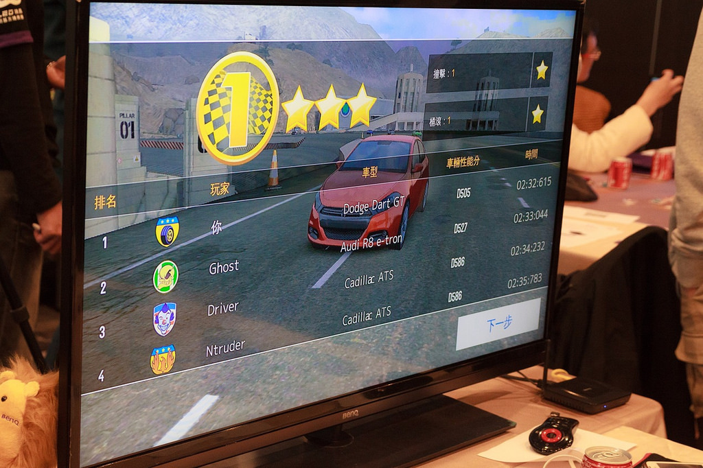 由於我們組預賽第二名,所以由我們組先跑,有玩賽車遊戲的網友一定知道,賽車遊戲一定同時比才刺激,不過受限於環境關系,雖然是分開來比,但是加上主持人的播報,現場氣氛超緊張的xd,這場是筆者參加那麼多場體驗會,第一次覺得活動中的競賽那麼刺激的xd。